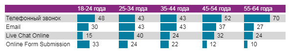 Телефон - основной способ контакта с брендами электронной торговли, причем, популярность этого канала связи по сравнению, например, с использованием чата, оказалась выше даже среди молодых людей. По большому счету, чат более или менее освоен пока только людьми в возрасте 24-35 лет, но в то же время совсем молодые клиенты пользуются этим каналом даже реже пожилых. При этом респонденты в возрасте 18-24 лет гораздо охотней используют для обращения онлайн-форму, в то время как среди людей старше сорока пяти лет этот способ практически не используется.