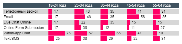 Бренды активно вводят в работу техподдержки новые методы обращения, но люди все равно чаще хотели бы описывать возникающие проблемы «по старинке». Например, с помощью обычного текстового сообщения, популярность которого практически не зависит от возраста клиента. Более того, обычное электронное письмо по-прежнему используется достаточно активно, а среди респондентов в возрасте 24-35 лет – это и вовсе самый популярный канал коммуникации.