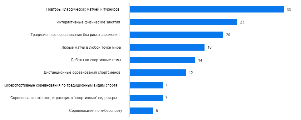 Многие бесконтактные виды спорта вполне возможно проводить удаленно. Например, по триатлону и другим видам атлетики. Это вполне можно было бы сравнить с уже имевшими место «концертами по скайпу», в которых солист находился в одной стране, а оркестр – в другой. Кстати, такой вид контента хотели бы смотреть 12% респондентов, что относительно немало.