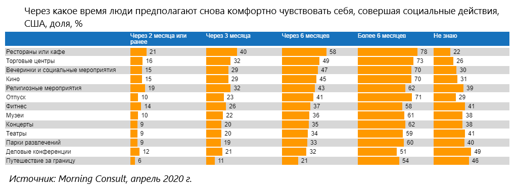 Карантин когда-нибудь закончится. Что дальше? Когда наступит «нормальная жизнь», да и наступит ли? Разумеется, будущего не знает никто, но каковы сегодня представления о нем? Данные опроса компании Morning Consult (США) показали, что лишь один человек из пяти полагает, что сможет посещать рестораны через два месяца. Рестораны в этом случае – это лишь индикатор потребительской и социальной активности, а ведь есть еще театры и концертные залы, ТРЦ и фитнес. Что с ними? Результаты исследования Morning Consult позволяют хотя бы немного представить себе будущее. Опрос проводился 7 - 9 апреля в США по национальной выборке 18+, было заполнено свыше 2000 анкет.