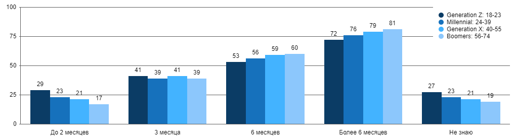 Молодые «рванут» в кафе или ресторан раньше других. Через два месяца это будет готов сделать почти каждый третий «зумер», в то время как среди пожилых ("бумеры") эта доля составит лишь 17%. Интересно, что через три месяца к посещению ресторана будут готовы примерно 40% людей независимо от возраста, и только затем подтянутся "пожилые".