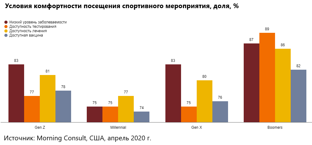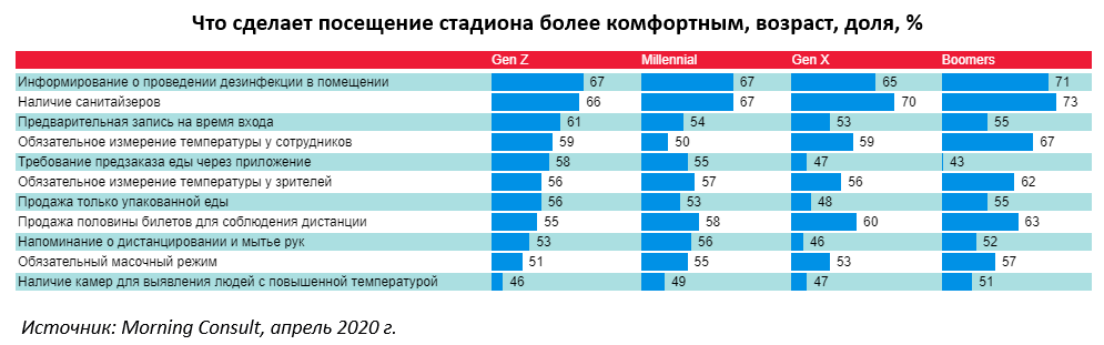 Исследователи выявили и поведенческие различия между поколениями. Например, миллениалы относительно спокойно относятся к ситуации. Каждый четвертый респондент считает проблемы, связанные с коронавирусом, не слишком существенными, а значит, готов отправиться на стадион хоть сейчас.