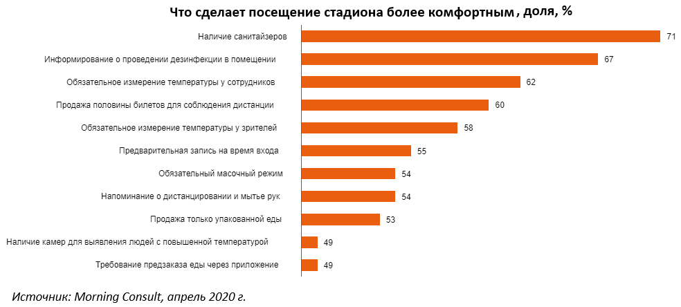 Пандемия COVID-19 переформатировала массовые мероприятия. Совершенно ясно, что технологические новшества и новые ритуалы на долгое время станут частью «постковидного» ландшафта. Каким он будет? Исследовательская компания Morning Consult (США) выяснила у любителей спорта при каких условиях они готовы вернуться на стадион.