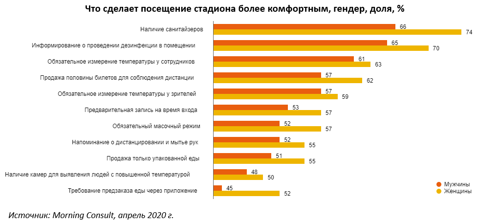 У женщин чаще возникает запрос на безопасное посещение спортивных мероприятий. Например, они скорее пойдут на стадион при наличии возможности помыть руки. Также женщины более толерантно относятся к ношению масок. Почему? Понять невозможно, надо запомнить.