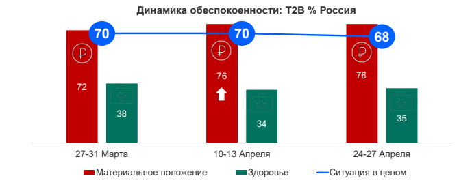 Угроза собственному здоровью, напротив, волнует жителей России все меньше – в конце апреля только каждого третьего. В мире ситуация похожая, хотя есть и исключения. Например, в Японии во время четвертой волны опроса (24-27 апреля) обеспокоенных здоровьем было 70%, в то время как материальным положением 58%.
