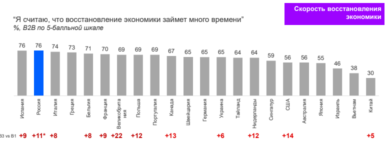 Похоже на то, что национальный характер действительно имеет значение. Вера в скорое восстановление экономики не всегда связана с уровнем обеспокоенности ситуацией в целом. Россия в даном случае – классический пример. За пессимизмом жителей нашей страны, скорее всего, стоят реальные обстоятельства, ведь значительно выросло количество людей, которые уже ощутили влияние кризиса на собственное материальное благополучие. В Китае ситуация противоположная: при практически тотальной напряженности, в скорое восстановление верят 70%.