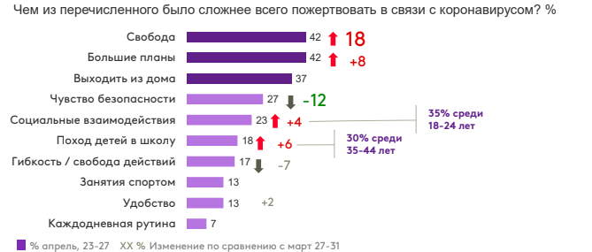 Ограничение свободы - самая быстрорастущая боль россиян, находящихся на карантине. Всего за один месяц доля респондентов, отметивших этот пункт в своей анкете, выросла на 18 пп и сравнялась с долей тех, кому было трудно пожертвовать большими планами (по 42%). А вот к ощущению опасности мы, похоже, начинаем привыкать - минус 12 пп.