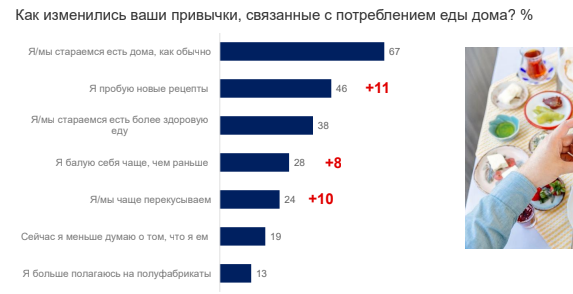 В условиях карантина изменяются не только стремления и страхи, но и привычки. Россияне все больше вовлекаются в эксперименты с новыми рецептами и чаще балуют себя перекусами. При этом отношение к здоровому питанию остается важным аспектом лишь для трети российских респондентов.