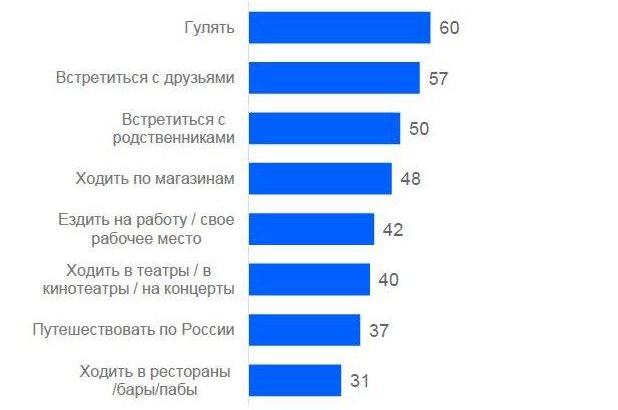 Производители думают, что, выйдя из карантина, люди встанут в очередь за их товарами и услугами. Скорее всего, будет немного иначе. На диаграмме ниже ранжированы действия, которые на самом деле хотят совершать освобожденные россияне. Гулять, «тусить», встречаться с родными, - это прежде всего. А магазины, концерты, путешествия и рестораны - потом.