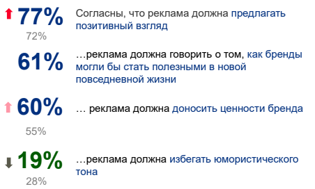 По мере протекания карантина постепенно возрастает запрос на позитив в рекламе, при этом юмор становится все менее уместным. Люди по-прежнему хотят от брендов «новых вечных ценностей», а именно – рассказов о том, как бренд может помочь им адаптироваться в «постковидной» реальности.