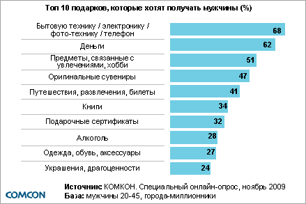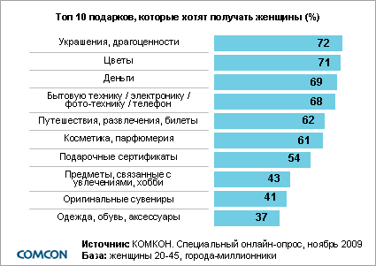 А вот более дорогие и качественные подарки вызовут приятные эмоции у получателя. По данным КОМКОН, около 70% женщин больше всего мечтают о драгоценностях, цветах и деньгах. Бытовая техника, электроника или телефон под новый год порадуют 68% женщин и такое же количество мужчин.
