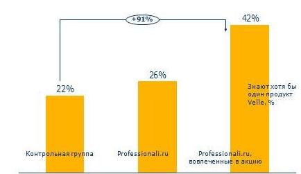 Между тем, принципиальных сложностей в измерении ROI нет. Вполне достаточно действовать ровно так же, как если бы речь шла об измерении эффективности обычной рекламной кампании: создавать тестовые и контрольные группы, проводить опросы и т.п. Конечно, некоторая специфика в измерениях в среде соцсетей есть, но ее вполне можно учесть на уровне формулировок опросов. Для того, чтобы продемонстрировать возможность подобного решения, в апреле 2010 года компании Bojole Research и Online Market Intelligence (OMI) провели модельный эксперимент по измерению эффективности продвижения реального бренда в реальной социальной сети. В качестве таковых были выбраны сеть professionali.ru и бренд Velle (биоовсяный продукт). Выбор именно этой кампании для модельного эксперимента был продиктован тем, что активность бренда в оффлайне, практически, отсутствовала. Это не является принципиально важным ограничением для подобных измерений, однако выделение одной активности из комплексной кампании всегда ведет к увеличению необходимого бюджета, что вряд ли можно считать приемлемым для модельного эксперимента.