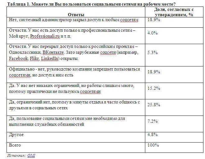 Онлайн-опрос, проведенный компанией Online Market Intelligence (OMI) в июне 2010 года помог узнать важные детали о том, кто, кому и насколько жестко запрещает использовать социальные сети на работе. В опросе приняло участие 5000 человек, проживающих в крупных городах России.