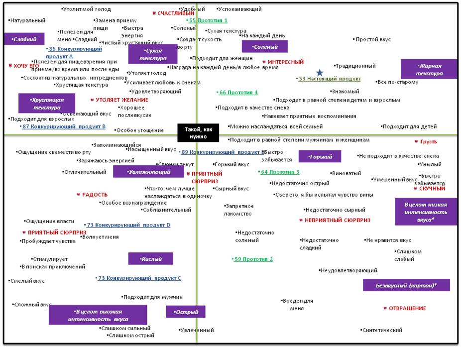 Число перед каждым продуктом означает процент респондентов, отметивших три наиболее позитивных варианта оценки по шкале привлекательности. Потребительские атрибуты указаны черным цветом. Сенсорные атрибуты указаны белым цветом. Красные атрибуты относятся к эмоциям
