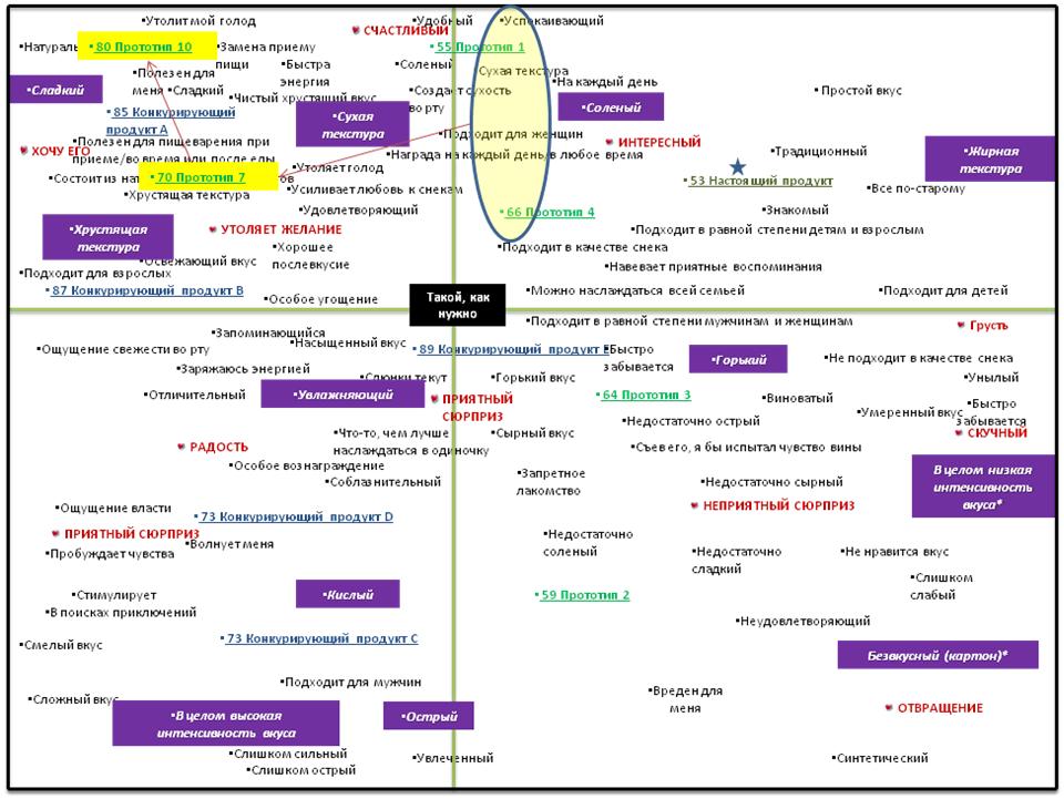 Число перед каждым продуктом означает процент респондентов, отметивших три наиболее позитивных варианта оценки по шкале привлекательности. Потребительские атрибуты указаны черным цветом. Сенсорные атрибуты указаны белым цветом. Красные атрибуты относятся к эмоциям.