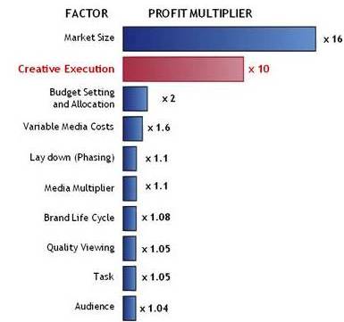 своей статье, опубликованной в 2006 году в журнале AdMap, приводят таблицу, которая содержит ранжированный список факторов, влияющих на эффективность рекламы, т.е. ее способность приносить прибыль. Приведенные в таблице мультипликаторы показывают, во сколько раз может увеличиться эффективность рекламы, если «при прочих равных» уделить данному фактору соответствующее внимание.