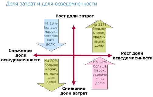 Зависимости, показанные на диаграмме, получены экспертами Millward Brown на основе анализа рекламных кампаний более 300 брендов, входящих в различные товарные категории. Как легко видеть, увеличение доли бренда по абсциссе («осведомленность о рекламе марки») делает более вероятной увеличение его доли рынка. Но симметрии нет: для тех, кто снижает долю своих рекламных затрат в категории изменения доли рынка не всегда могут быть отрицательными, если, конечно, они предложат потребителям более сильный креатив. Другими словами, точное знание собственной позиции действительно может помочь сделать правильные акценты и достичь нужного результата меньшей ценой.