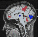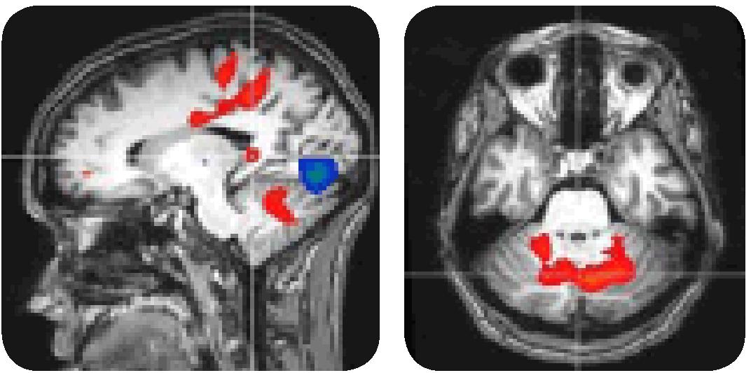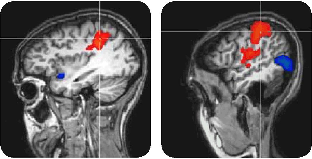 Примечание: красная область на фотографиях представляет кровоток, более насыщенный кислородом (соответственно, более активированный), вызванный физической рекламой. Синие зоны – это области, более активированные виртуальной рекламой. На эти области мозга указывают "перекрестья".