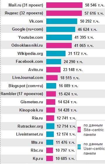 Как легко видеть, рейтинги различаются. Однако отличия в деталях не меняют главного: базовые параметры ведущих ресурсов по порядку величин близки, различаются лишь их места в рейтинге, а это для наших целей несущественно.