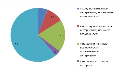 Потенциал последних двух групп с точки зрения вероятности подключения к Интернету в ближайшее время близок к нулю. В самом деле, о чем можно говорить с людьми, которые о предмете беседы говорят, что они его «не знают и знать не хотят»? Поэтому мы будем подробнее рассматривать два других сектора: тех, кто все-таки знает, что такое Интернет, но в одном случае «хочет, но не может», а в другом, «может, но не хочет».
