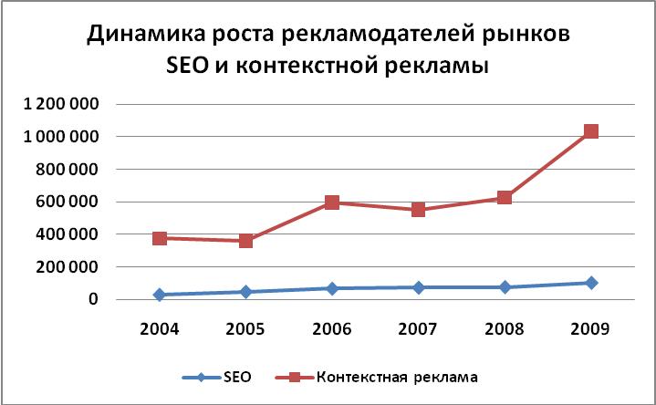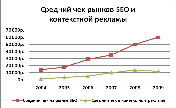 Компания «Вебпроекты» в октябре-ноябре 2009 г. провела опрос игроков рынка интернет-рекламы, в котором приняло участие более 400 респондентов. Анализ полученных данных, проведенный компанией «Ашманов и партнеры», показал, что объем рынка поисковой оптимизации в 2009 г. может составить примерно $195 млн. Для сравнения – аналогичный показатель для контекстной рекламы - $400 млн. Интересно, что рост «контекста» в 2009 году замедлился, в то время как поисковая оптимизация, напротив, продолжила набирать обороты. О потенциале SEO говорит также рост «среднего чека», который за нынешний год вырос с 50 тыс. руб. до 60 тыс. руб., в то время как затраты «среднего рекламодателя» на контекстную рекламу остались неизменными. Таким образом, рост рынка контекстной рекламы был обеспечен притоком новых рекламодателей, как правило, имеющих небольшой, «пробный» бюджет.