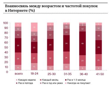 Самые активные покупатели – это представители двух возрастных групп: от 18 до 24 лет и от 31 года до 35 лет. Доля респондентов из числа этих двух групп, которые делают покупки в Сети каждую неделю, составляет 15% и 14% соответственно, что выше аналогичных показателей по всем остальным возрастным группам. Эти же возрастные группы, по данным ФОМ, самые многочисленные в русскоязычном Интернете.
