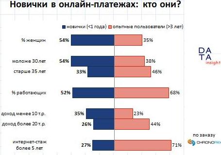 Как легко видеть из приведенной выше диаграммы, менеджеры интернет-магазинов должны будут скоро корректировать свою маркетинговую тактику: «новички» - это другие люди. У них меньше доход, они моложе, половина из них еще не работает, среди них гораздо больше женщин, чем среди опытных пользователей. Простая же экстраполяция текущей ситуации на завтрашний день, пусть и с учетом очевидных изменений, может дать существенные искажения.