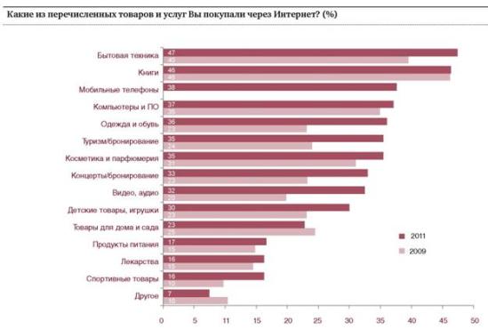 Согласно данным PwC, «чаще всего участники опроса покупали в Сети бытовую технику, книги, мобильные телефоны, а также компьютеры и программное обеспечение. Заметнее всего увеличилось количество покупателей в следующих сегментах: одежда и обувь (13%), видео- и аудиопродукция (12%), а также бронирование через Интернет билетов в туристические поездки (11%) и на развлекательные мероприятия (10%)».