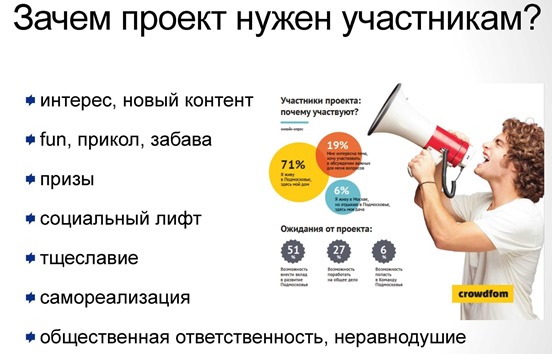О методах рекрутинга людей для краудсорсингового проекта: "В разных городах работают разные каналы. В Москве - ВКонтакте, в Волгограде - городские советы"