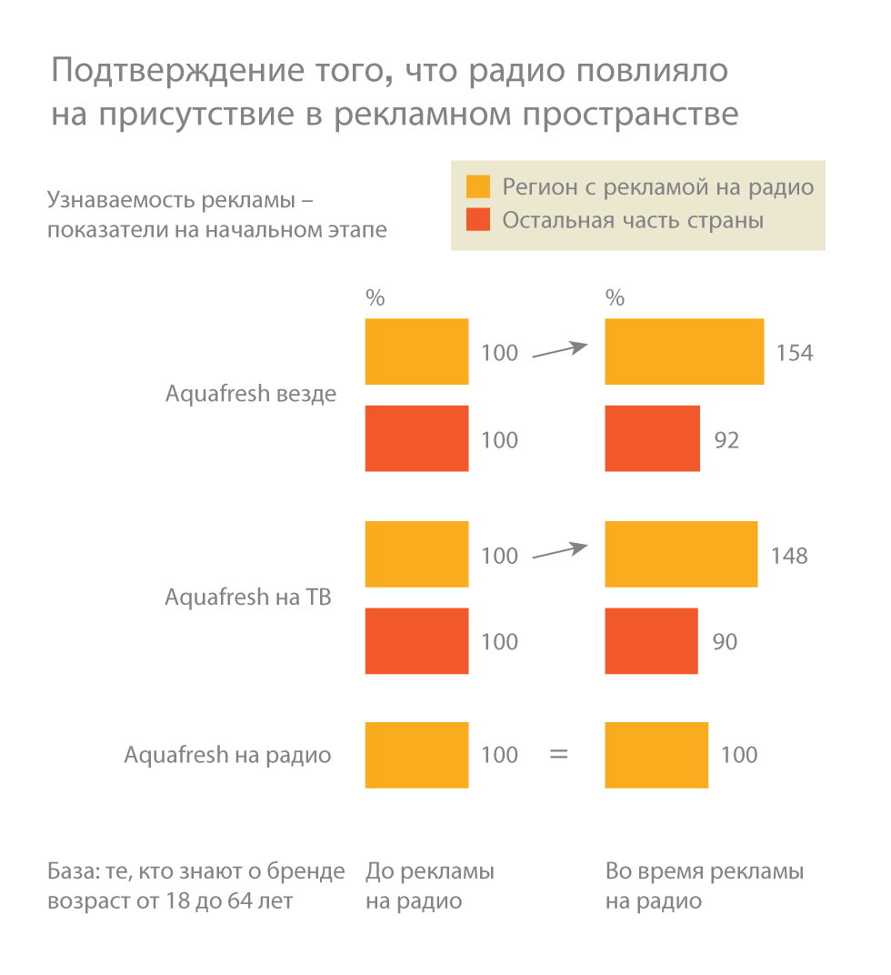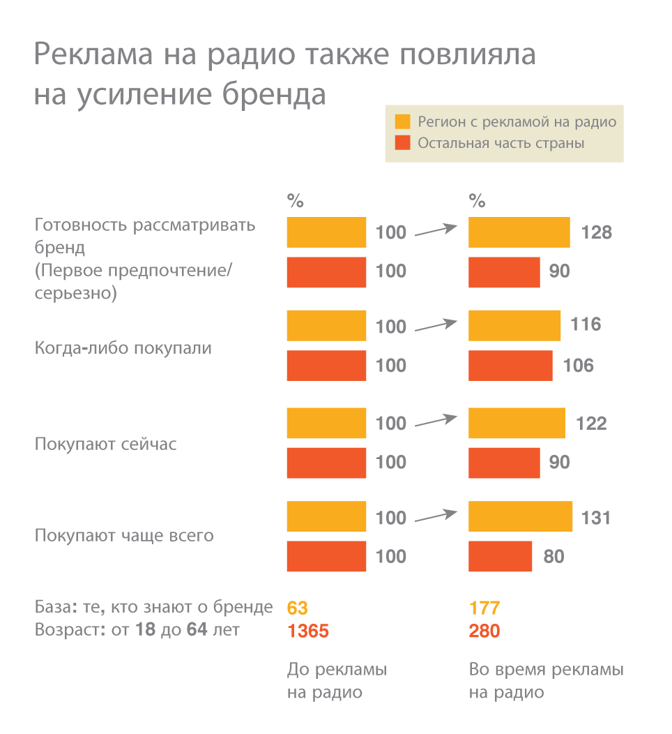 Рост индекса узнаваемости рекламы на любом медиа со 100 до 154 пунктов с точки зрения стоимости эквивалентен приобретению на телевидении 30 GRP. Главное, что обеспечила реклама на радио, - это эффективное продление присутствия в рекламном пространстве и стимулирование намерений покупки данного бренда.