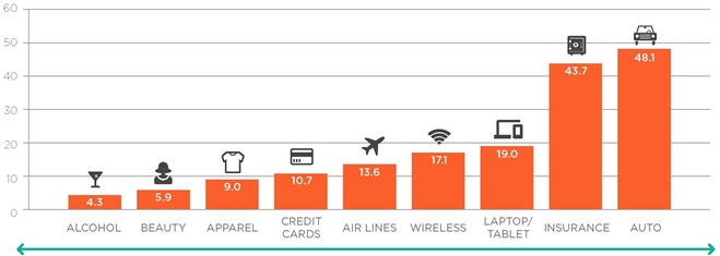 Исследователи из Millward Brown построили диаграмму, которая количественно определяет среднее время «цикла покупки» в разных категориях.