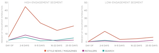 Слева на приведенном графике представлены результаты активности покупателей, постоянно интересующихся продукцией косметических компаний, справа – с низкой степенью вовлеченности в категорию. В ходе исследований использована панель Compete, период наблюдений – 30 дней. По сути, графики демонстрируют различие восприимчивости к рекламе двух внешне одинаковых групп целевой аудитории.