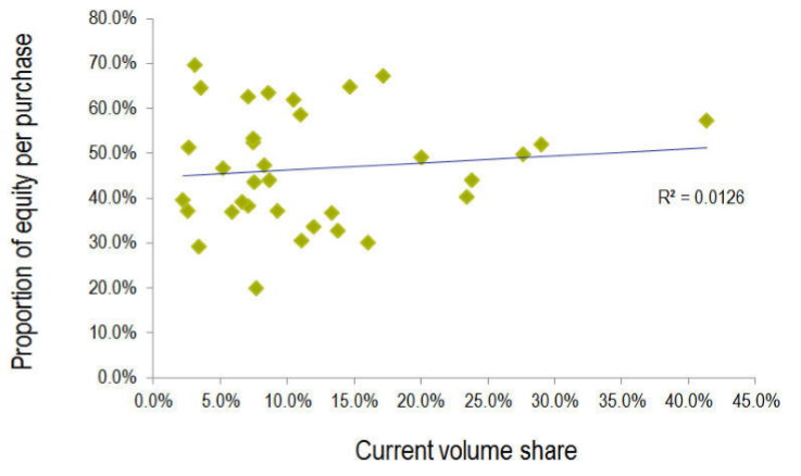 Как легко видеть из приведенной диаграммы, отношение ценности бренда к продажам сильно варьирует и, практически, не коррелирует с долей бренда в текущих продажах. Другими словами, у некоторых брендов получается заботиться о своих потребителях гораздо лучше, чем у других (или же им удается создать такое впечатление). Потребители чувствуют такое отношение и реагируют соответствующим образом. Если бы, как это следует из выводов профессора Шарпа, отношение потребителей к бренду определялось лишь дистрибуцией, то коэффициент корреляции в рассматриваемых осях был бы сопоставим с единицей. Но это не наблюдается. .