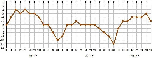 Согласно данным Росстата РФ общее производство стоит на месте и идет «скорее вниз, чем вверх». А как еще отнестись к доле 99,6% за второй квартал 2016 года по отношению к соответствующему периоду 2015 г.? Впрочем, разница 0,4%, рассчитанная к тому же по оперативным данным, статистически неотличима от нуля. Но это не означает отсутствия внутренних изменений.