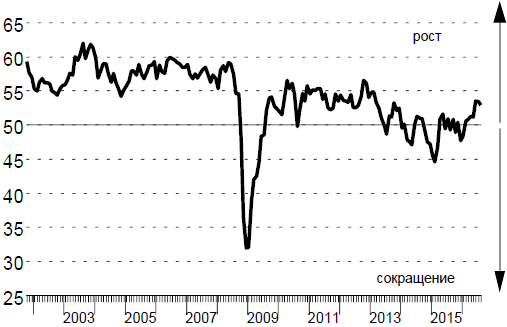 Данные британской компании Markit характеризуют, скорее, будущее, чем настоящее, и они чуть более оптимистичны. В ходе своего глобального проекта исследователи опрашивают в каждой стране по 300 представителей каждой из групп компаний – обрабатывающей промышленности и сферы услуг. Респондентов просят оценить текущую ситуацию и возможности ее изменения по пяти факторам, включающим в себя новые заказы, производство, занятость, поставки, запасы. По результатам опроса определяется индекс деловой активности PMI (Purchasing Managers Index). Считается, что этот индекс позволяет достаточно надежно предсказать поворотные точки делового цикла. Нулевой линией в данном случае считается значение 50%. С большой долей условности можно считать, что если PMI ниже этого уровня, то в ближайшем будущем более вероятен спад, если выше – то подъем.