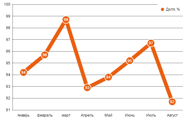 Как видно из приведенной диаграммы, настроения участников рынка меняются циклично: в начале календарного года жизнь видится производственникам лучшей, чем ближе к его концу. Заметим, однако, что все оценки последних лет, начиная с 2014 года, находятся в области отрицательных значений. Может быть, в отдельные месяцы жизнь и налаживается, но пока не наладилась. Данные августа свидетельствуют о том, что сейчас происходит спад, который можно назвать сезонным.