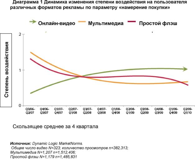 Анализ базы данных MarketNorms® компании Dynamic Logic показывает, что видео-ролики, действительно, теряют свою эффективность в формировании некоторых параметров бренда, например, по показателю «осведомленность» (awareness) по сравнению с другими рекламными форматами (см. ниже «Определения»). Так, по данным того же источника, за последние три года средний уровень воздействия на потребителя составлял для видео-роликов по показателю «осведомленность» в 2007 году 15,8%, а в 2010 - 7,9%. В итоге, сегодня видео-реклама оказалась по этому показателю на одном уровне с другими рекламными форматами.