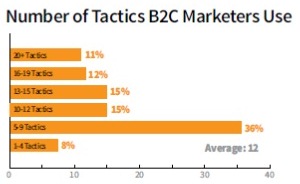 В среднем В2С-маркетолог использует 12 приемов. В общем же, чем больше компания, тем больший набор приемов используется. Компании с более чем 10 тыс. сотрудников используют в среднем 16 приемов, тогда как самые маленькие компании – в среднем 10.