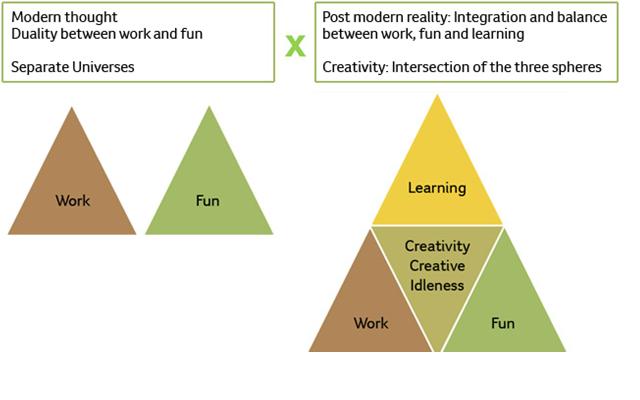 Лишь Доменико Де Мази изучает отношения между работой, досугом и креативностью. Де Мази не выступает апологетом праздности, но защищает необходимость существования баланса между работой, досугом и образованием. «В понятии творческого безделья соединены три фактора: работа (которая приносит благосостояние), учеба (которая приносит знания) и досуг (который приносит радость). Это не то же самое, что безделье, или свободное время, или ленность. Я против лени, я сам совершенно не ленив».