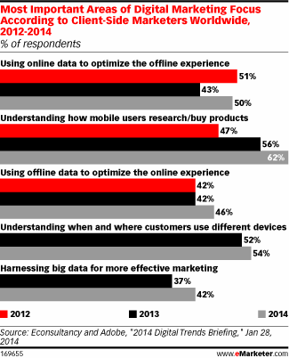 В последние несколько лет термин Big Data («Большие данные»), буквально, «взорвал Интернет». По данным глобального опроса, ежегодно проводимого Econsultancy и Adobe с 2012 года среди маркетологов компаний, «большие данные», характеризующие действия людей в Интернете, могут многое. Они способны оптимизировать оффлайновые бизнес-процессы, помочь понять как владельцы мобильных девайсов пользуются ими для поиска информации или просто «сделать маркетинг лучше», т.е. эффективнее. Причем, последняя функция год от года все популярнее, как это следует из приведенной нами диаграммы.