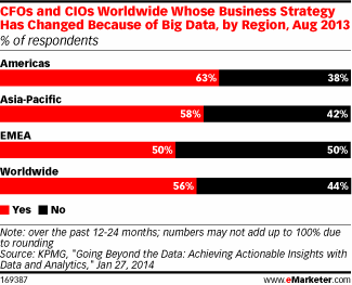 Заметим, что национальность респондентов большого значения не имеет. Как показывает опрос, проведенный KPMG в 2013 году, доля «оптимистов», т.е. тех, кто использует Big Data при разработке бизнес-стратегии, составляет 56%, причем, колебания от региона к региону невелики: от 63% в североамериканских странах до 50% в EMEA.